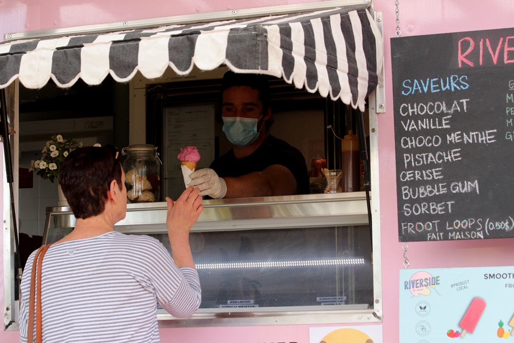 Pour Monique, ce sera cerise, une boule dans le cornet sucré que lui tend une main gantée.