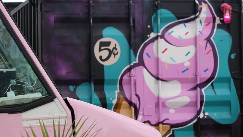 Au pied des silos, un camion de crème glacée lui fait écho. Rose, lui aussi. Le rose bubblegum de l’Amérique heureuse et lointaine de Donald Duck. Sur la paroi d’un conteneur, un cornet Dairy Queen tire-bouchonne sa crème molle à 5 cents, saupoudrée de pépites fluo.