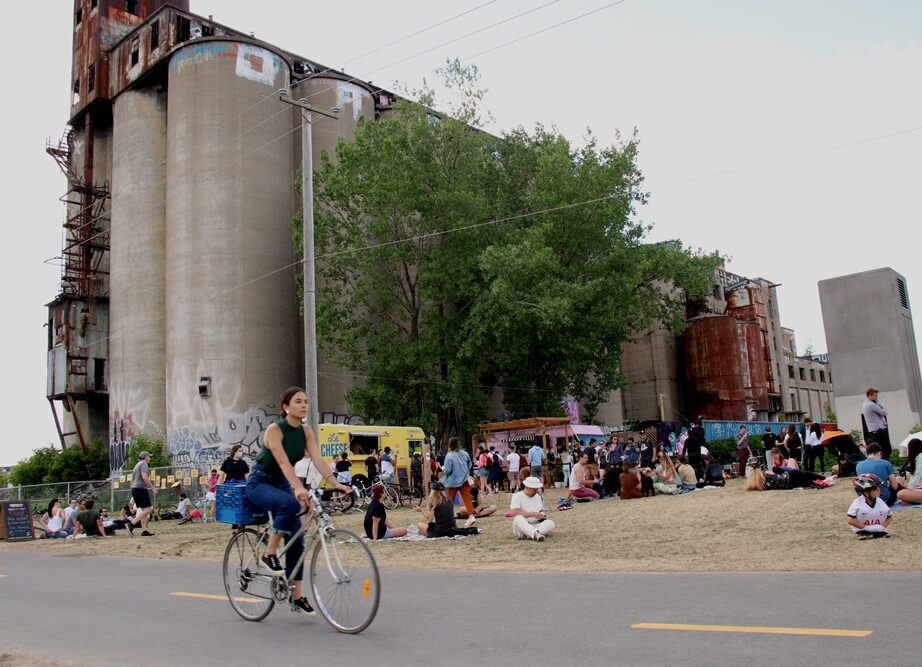 La carcasse de la Canada Malting tatouée de graffitis dresse une toile de fond Street Art à la scène champêtre urbaine. Un groupe de jazz en shorts fait revivre les standards des grands maîtres, ti-gars du quartier Saint-Henri. Le solo de trombone étire ses notes, tranquille. Les jambes prennent leurs aises. Le deux-mètres prescrit perd du terrain.