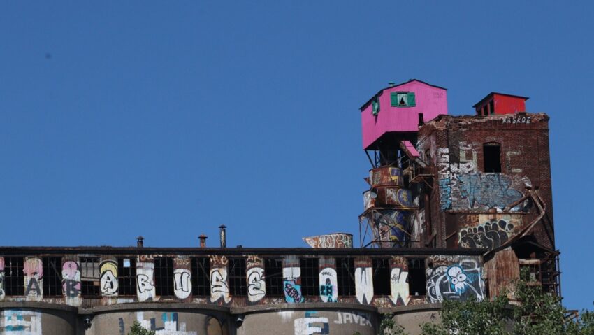 Là-haut, sur la crête des silos, une pimpante cahute s’agrippe à la falaise de briques. Œuvre anonyme d’un artiste téméraire, elle a fleuri sur les décombres. À ses fenêtres aux volets verts sont accrochées des jardinières de géraniums en plastique. Elle est rose. Rose bonbon, rose cucu, comme l’espoir de jours meilleurs, comme le bonheur perdu.