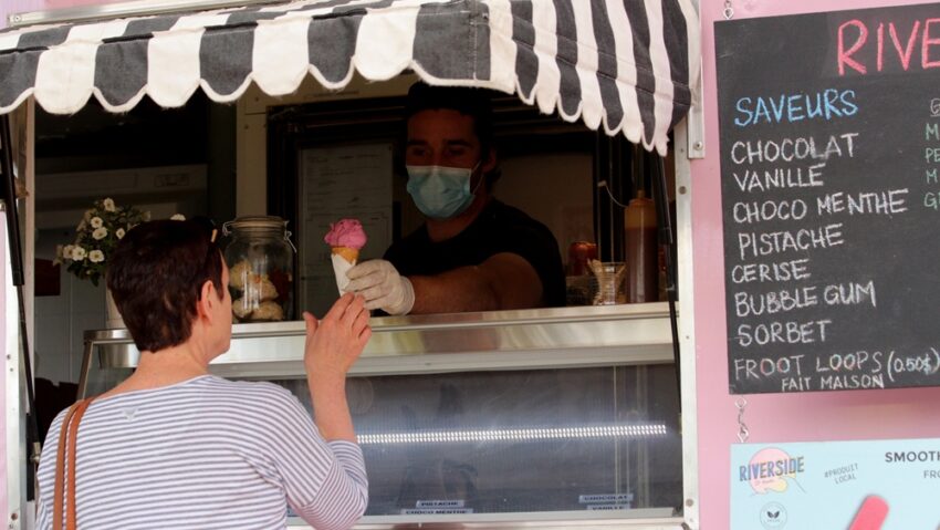 Pour la dame, ce sera cerise, une boule dans le cornet sucré que lui tend une main gantée.