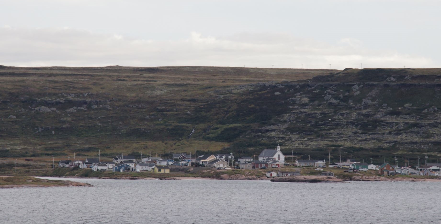 Malheureusement, il n’y a pas grand-chose à voir dans ce lieu de passage entre deux nulle-part. Le bourg de Lourdes-de-Blanc-Sablon est à quelques kilomètres. Le littoral, plat et râpé, donne un avant-goût du désert monotone de la toundra de l’arrière-pays. Le paysage de la baie n’est pas animé d’îlots et de récifs. Un bas-relief flou de montagnes se découpe au loin sur l’autre rive du détroit de Belle-Isle. Nous sommes au nord du nord de Terre-Neuve, et au sud d’une autre immensité grandiose qui se traverse avec une bonne réserve de carburant et de musique country.