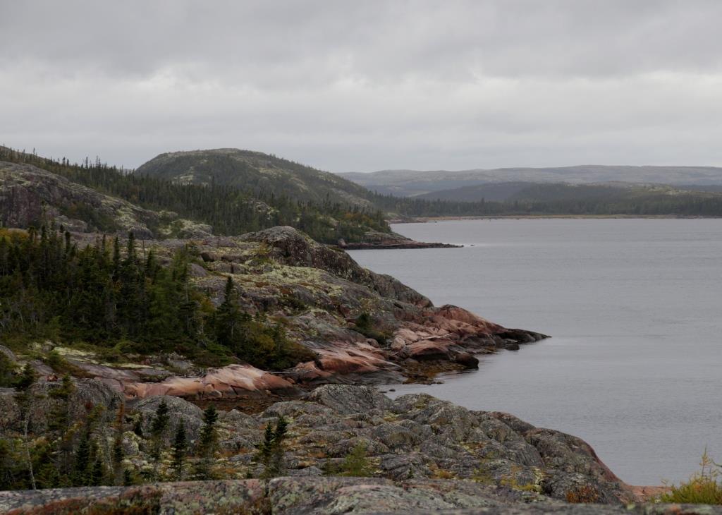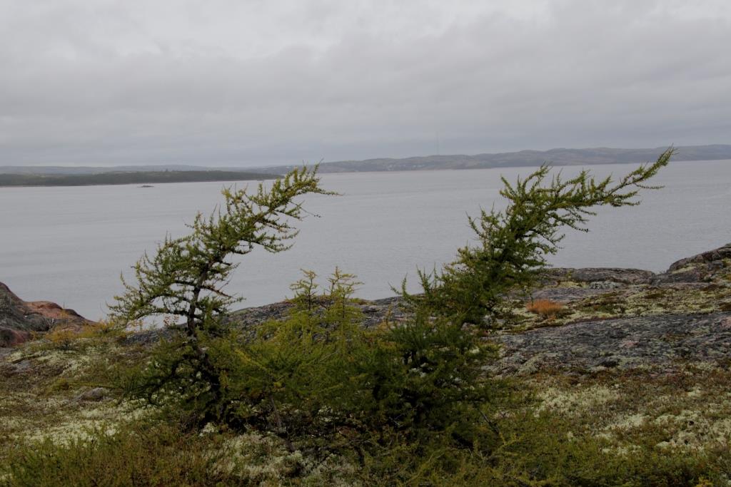De la petite butte avoisinante, le paysage s’étend à perte de vue sans l’ombre d’une présence humaine. Tout est minéral, la terre, la mer, le ciel. La baie est dentelée de caps gris et vert lichen, teintés de rouille dans la zone délavée par les marées. De maigres bosquets d’épinettes s’agrippent dans les crevasses à l’abri du nordet. Pas le moindre mouchoir de poche où une carotte pourrait prendre racine.