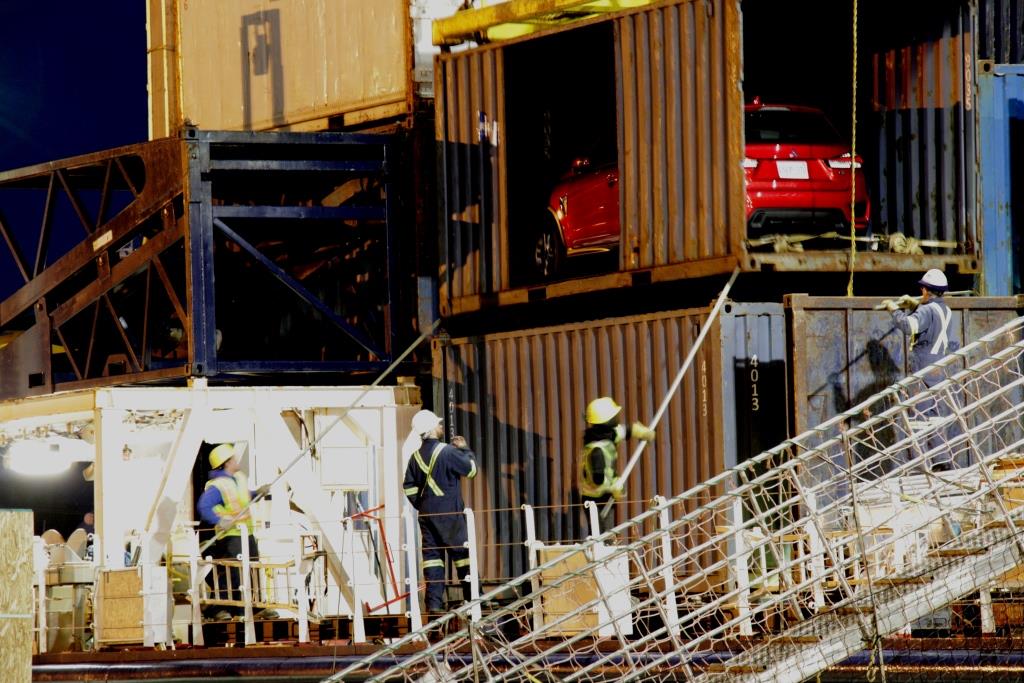 Je me réveille en sursaut. Un rugissement de moteur. Les propulseurs d’étrave ! Même endormi, j’en déduis que le Bella ne navigue pas en direction de Havre-Saint-Pierre, mais est en train d’accoster à Tête-à-la-Baleine ! Je m’habille à tâtons et me dirige vers un hublot du Pont 6. Les propulseurs collent le bateau au quai pour éviter le roulis et soulager les amarres. Des trombes d’eau balaient le halo jaunâtre des projecteurs. Deux débardeurs en fluo ruisselant arriment un conteneur qui s’élève péniblement. Plus tard, le grutier me dira que la manœuvre était limite, que des rafales cognaient à 60 nœuds (110 km/h) quand le bateau est reparti directement vers Havre-Saint-Pierre en sautant les escales de La Romaine, Harrington Harbour et Natashquan.