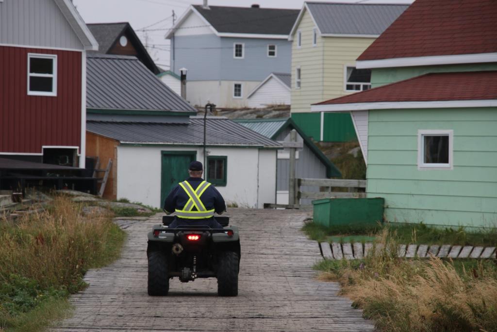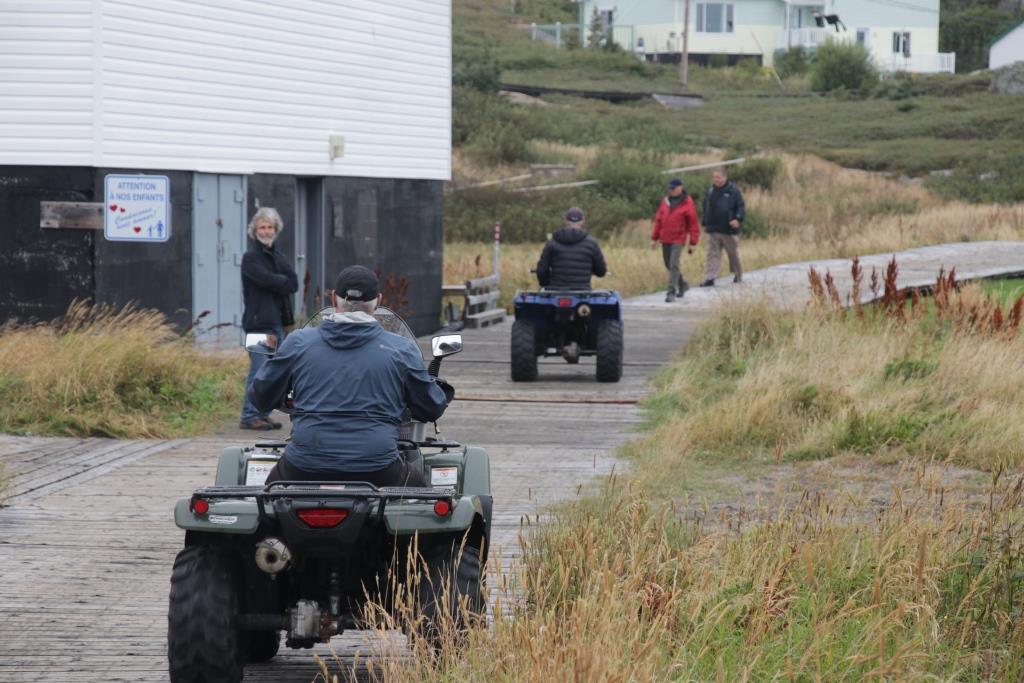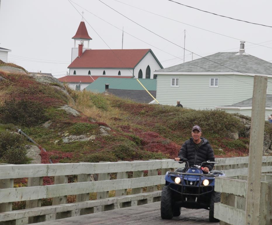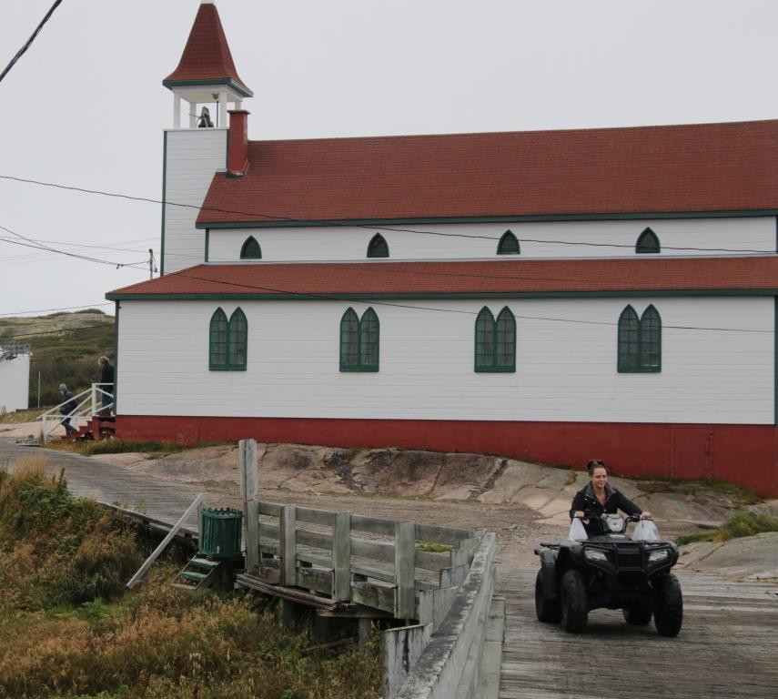 Grimpons clandestinement à l’arrière de l’un ces petits bolides pour faire le tour de l’île. La balade s’apparente à un tour sur le Monstre, la montagne russe de La Ronde, à Montréal. Il faut avoir le cœur bien accroché et les mains bien agrippées. Départ sur la plateforme de l’hélicoptère au sommet du village. Une pente dégringole jusqu’au quai, territoire dangereux où valsent les conteneurs et les chariots-élévateurs. Virage à 90o avant la coopérative pour prendre le pont de bois à gauche. D’un côté, le magasin général/agence SAQ qui va regarnir ses étagères avec les arrivages du Bella, de l’autre Paul’s Workshop et un poste d’essence. Plus loin, à gauche, le dépanneur et une cour à bois. Les enseignes sont rares ou discrètes ; la concurrence n’est pas féroce. Tous les commerces sont concentrés autour du havre, sur la seule partie plane de toute l’île. On ralentit pour slalomer entre les habitués du dépanneur, stationnés en plein milieu de la voie pour faire un brin de jasette. Côte à pic, poignée de gaz dans le tapis, le guidon encaisse les vibrations.