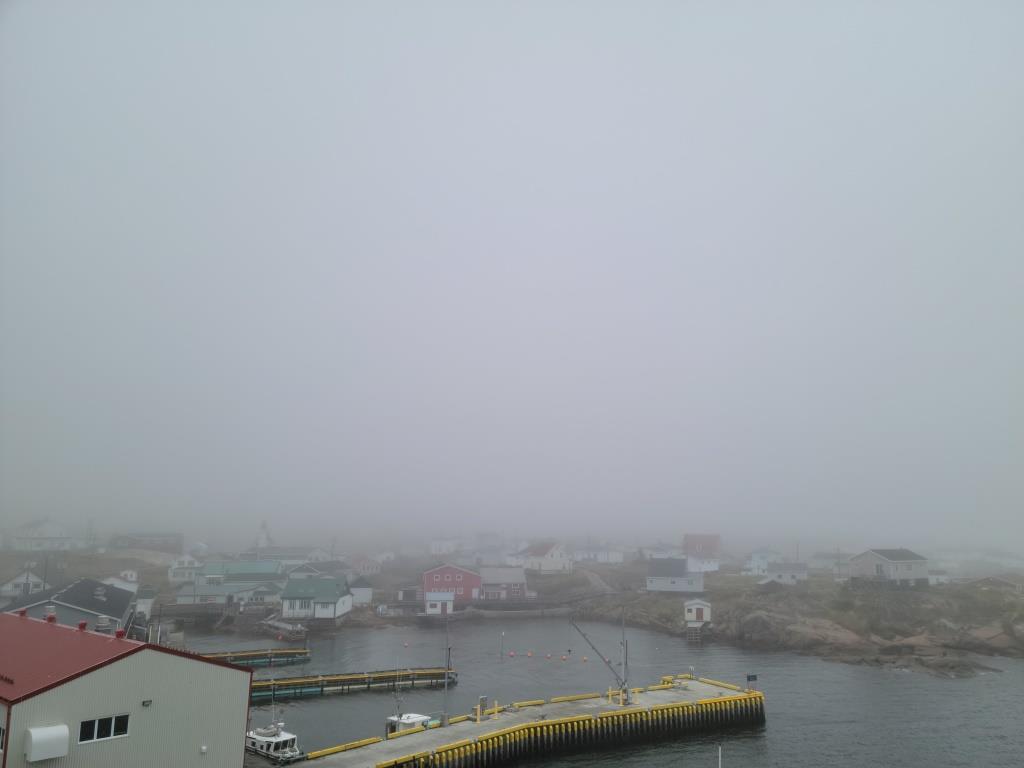 Pour renforcer l’illusion terre-neuvienne, un épais banc de brume estompe le village et laisse seul le Bella poursuivre son déchargement.