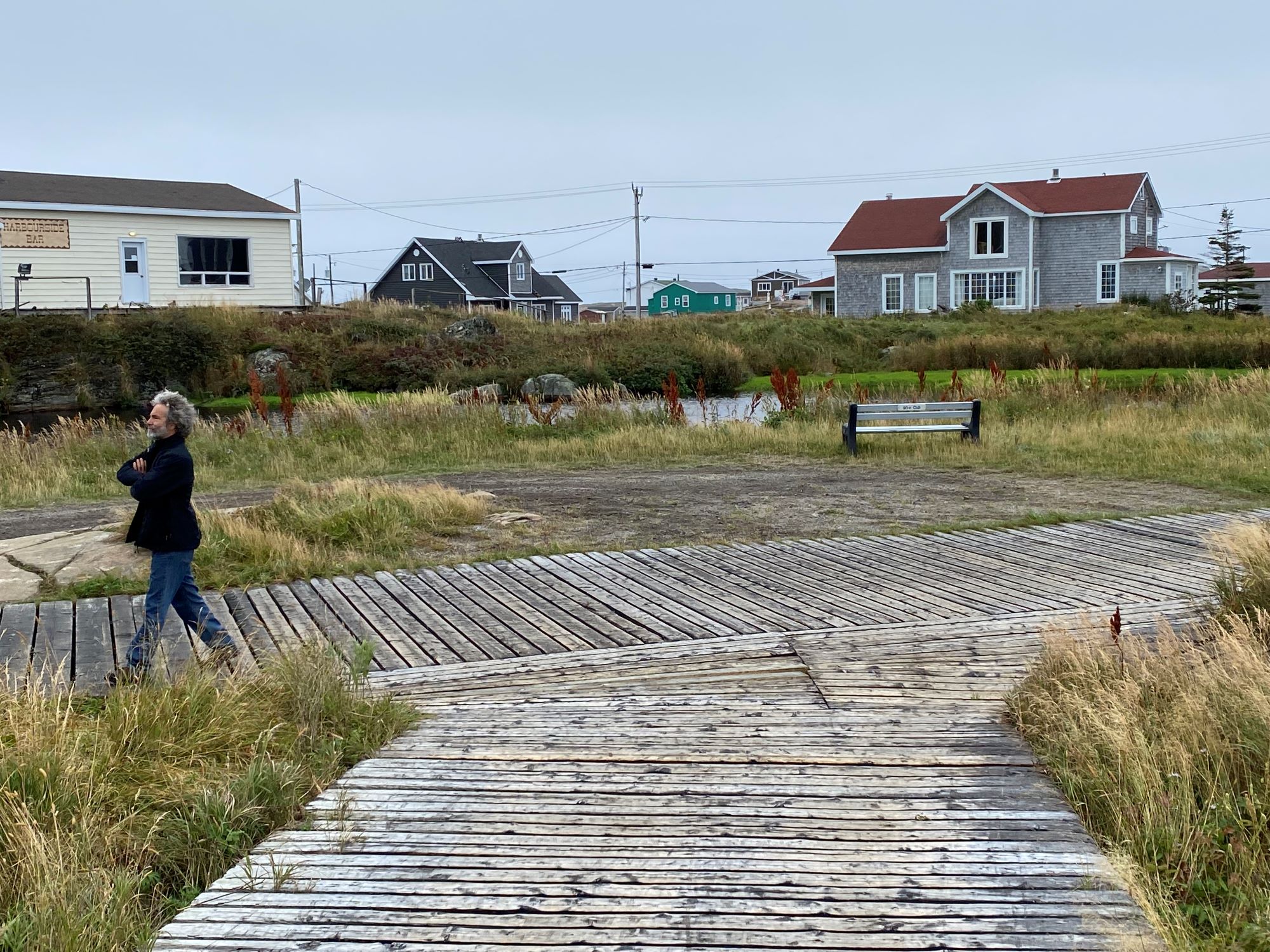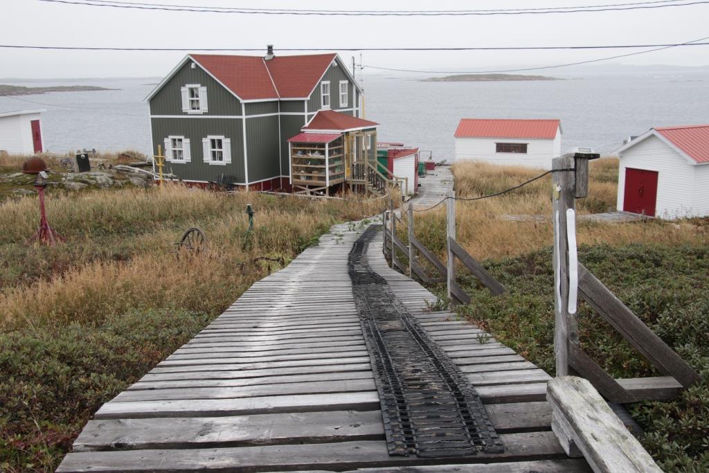 Sur des rampes de bois, des chaloupes ont été hissées au sec par un treuil. Aucun garde-fou sur les côtés. Un mauvais coup de guidon et c’est le vol plané sur le tapis de rochers. Embranchement à gauche vers l’église biconfessionnelle. On passe devant l’atelier Rowsell Welding and Repairs. Nom très répandu par ici. De l’artère principale s’échappent de petites veines qui conduisent à des maisons où un quatre-roues trône dans le driveway, comme en banlieue. Sous l’appentis attenant, les bûches de bois sont cordées pour l’hiver. Les casiers de crabe attendent le printemps. Après le réservoir d’eau, on file tout droit vers les hauts du côté Est. Les habitations sont plus clairsemées ; la chaussée est plus étroite; les croisements sont délicats. On mérite un merci de la main de l’usager que l’on laisse passer.