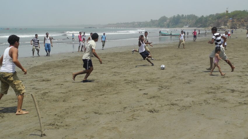 La plage du village, c’est aussi la place du village. On vient y prendre les nouvelles ; on y vend des tamales dans des feuilles de bananier. Les jeunes y jouent au futbol les soirs de marée basse : les torses nus contre les maillots. Les amoureux y guettent le rayon vert dans le soleil qui se glisse comme une pièce sur l’horizon.