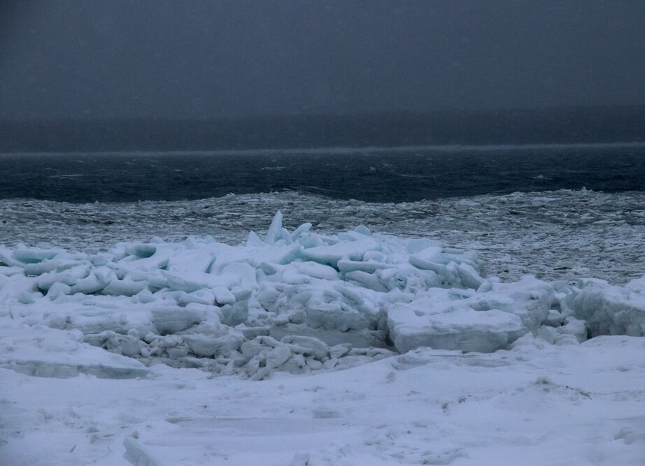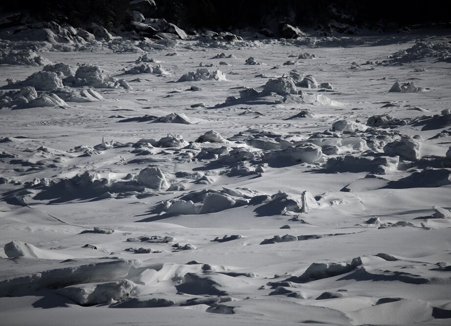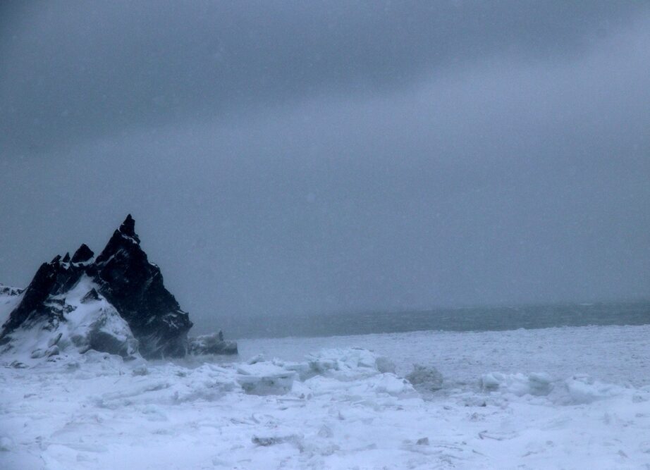 Le ciel, plombé par de lourds nuages gris et ardoise, s’affaisse sur l’île du Bic en face. Des trains de vagues déferlent leur écume sous zéro dans le chenal. Étrangement, cette houle venue du fond de l’est semble plus longue, plus ronde que la houle d’été avec ses vagues hachées. Est-elle engourdie par le froid, alourdie par les glaces qu’elle a charriées plus loin au fil des marées ? Les vagues fluides du large se cristallisent en un magma de glace en se rapprochant de la côte. Elles ondulent mollement comme un serpent, comme un marais qui respire, ni terre ni mer, ni eau ni glace. Plus près encore de la plage, elles se figent en sculptures désordonnées. Elles appartiennent maintenant à la terre.