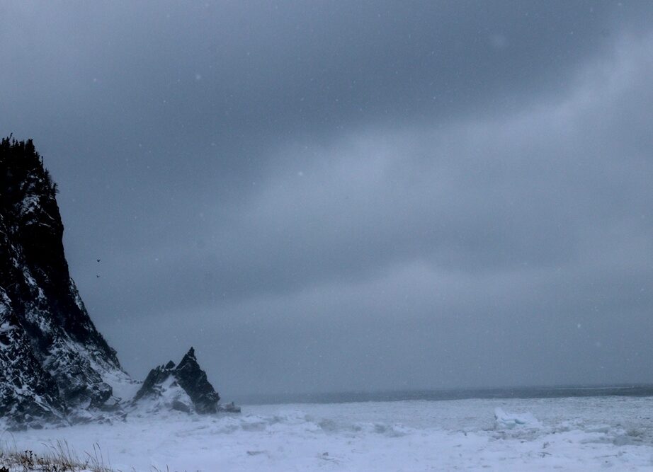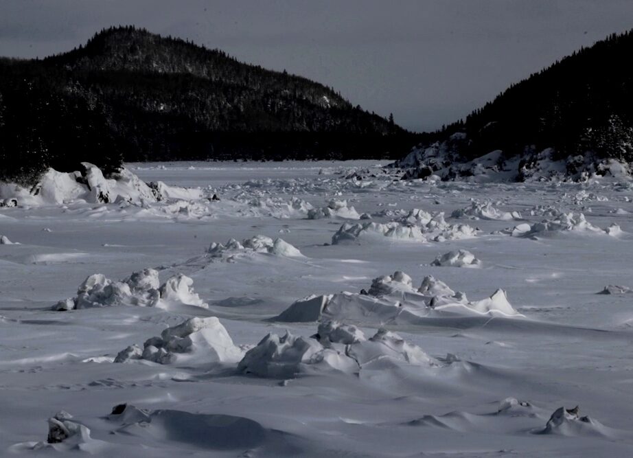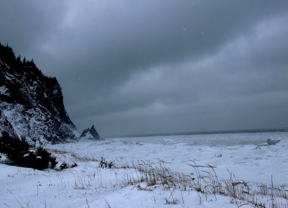 8 février. Le soleil a quitté la contrée, l’horizon aussi. Dans la forêt, les conifères dressés serré nous protègent de l’assaut des rafales. À l’orée des plages, les taillis rabougris laissent le vent balayer des coulées de neige folle dans l’étroit sentier qui s’efface devant nous. Nous longeons l’anse à Wilson, l’anse à Damase, l’anse à Voilier, déserts hérissés de blocs de glace enchevêtrés.