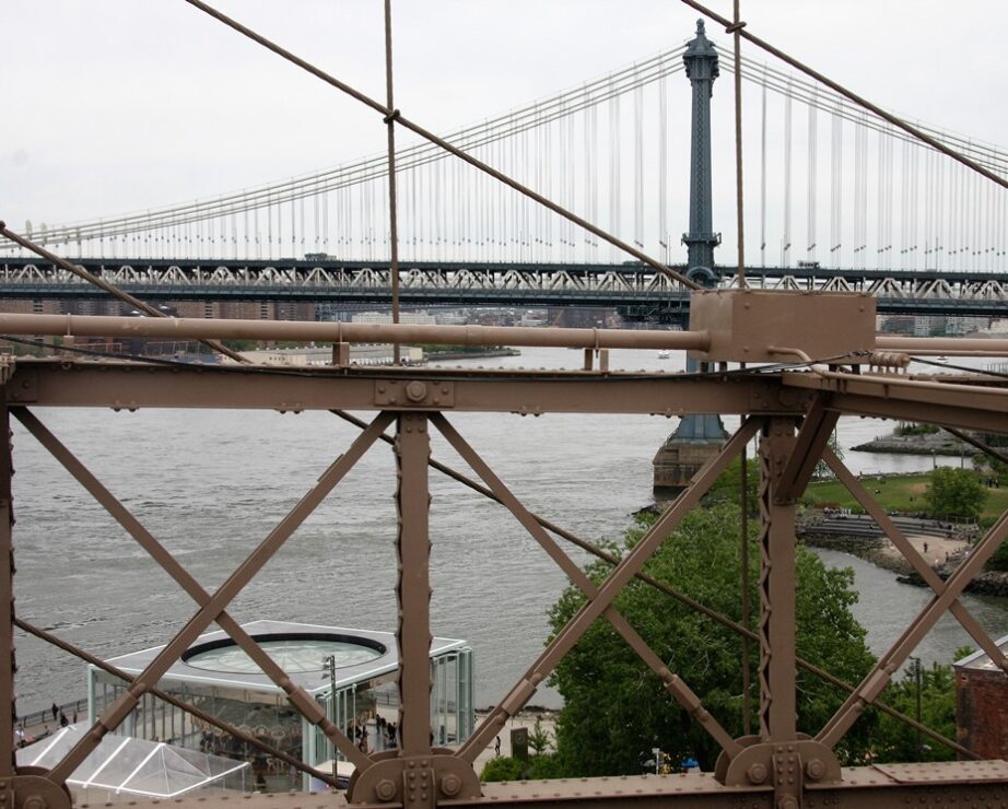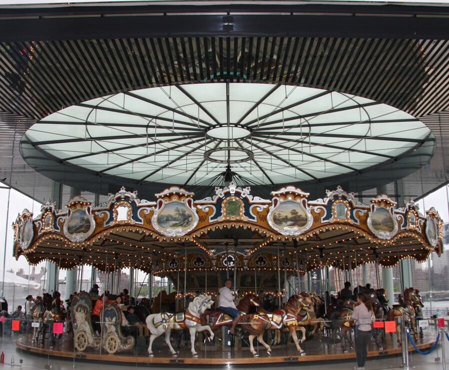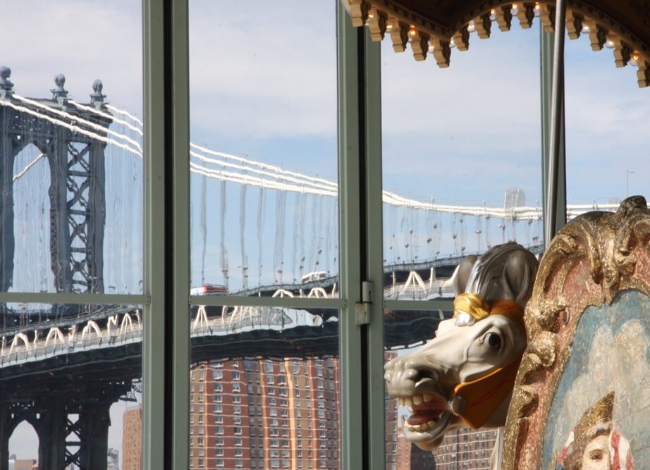 Pour se protéger des intempéries qui ont mis en péril sa première vie, le carrousel s’est réfugié sous un chapiteau de verre. Ses immenses baies vitrées encadrent les paysages du New York mythique : la silhouette du Manhattan Bridge immortalisée par l’affiche du film Anny Hall de Woody Allen ; la East River industrieuse aux eaux labourées par les barges et les bateaux-taxis ; la pointe de Manhattan hérissée de tours dominées par la Freedom Tower, fier doigt d’honneur de 104 étages.