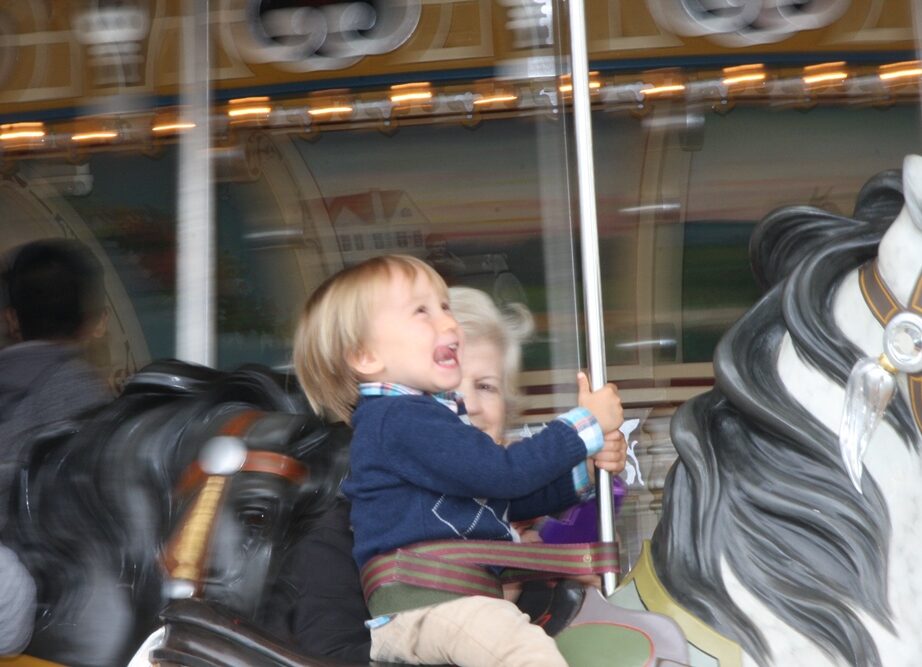 Trois coups de la cloche. Le manège s’ébranle ; les chevaux s’ébrouent. Des tubas pistons pompent les trois temps d’une valse bavaroise. Après un départ en puissance, le rythme s’accélère, le Um Pa Pa – Um Pa Pa prend son rythme de croisière. La vitesse entraîne lumières et couleurs dans un flou circulaire. Bien en selle, les enfants rient, les enfants rêvent, preux chevaliers et fières amazones. À chaque passage, ils agitent la main pour papa et maman, émerveillés, le téléphone-caméra tendu au bout du bras.