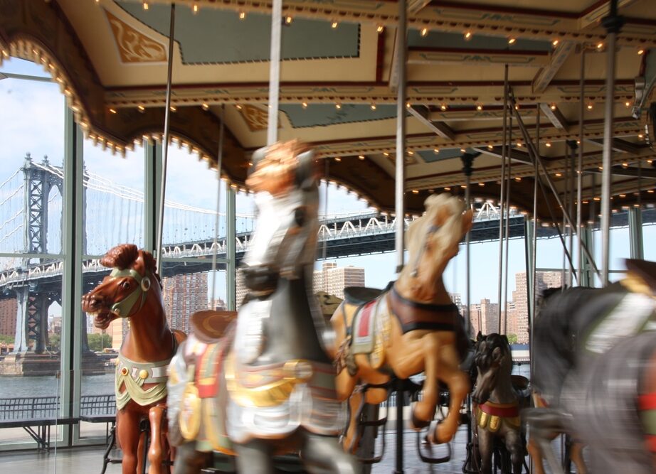 Les enfants du Jane’s Carousel n’entendent pas le flot sourd du trafic qui s’écoule nuit et jour là-haut sur le pont. Ils sont dans un autre monde. Le Jane’s Carousel est blotti au pied du pilier sud du Brooklyn Bridge. Oasis d’innocence au milieu de l’immense ruche de l’Amérique business. Clin d’œil nostalgique du bonheur tout simple de l’ère prévidéo.