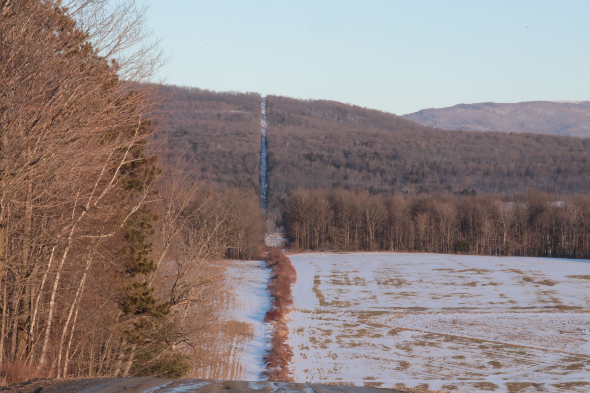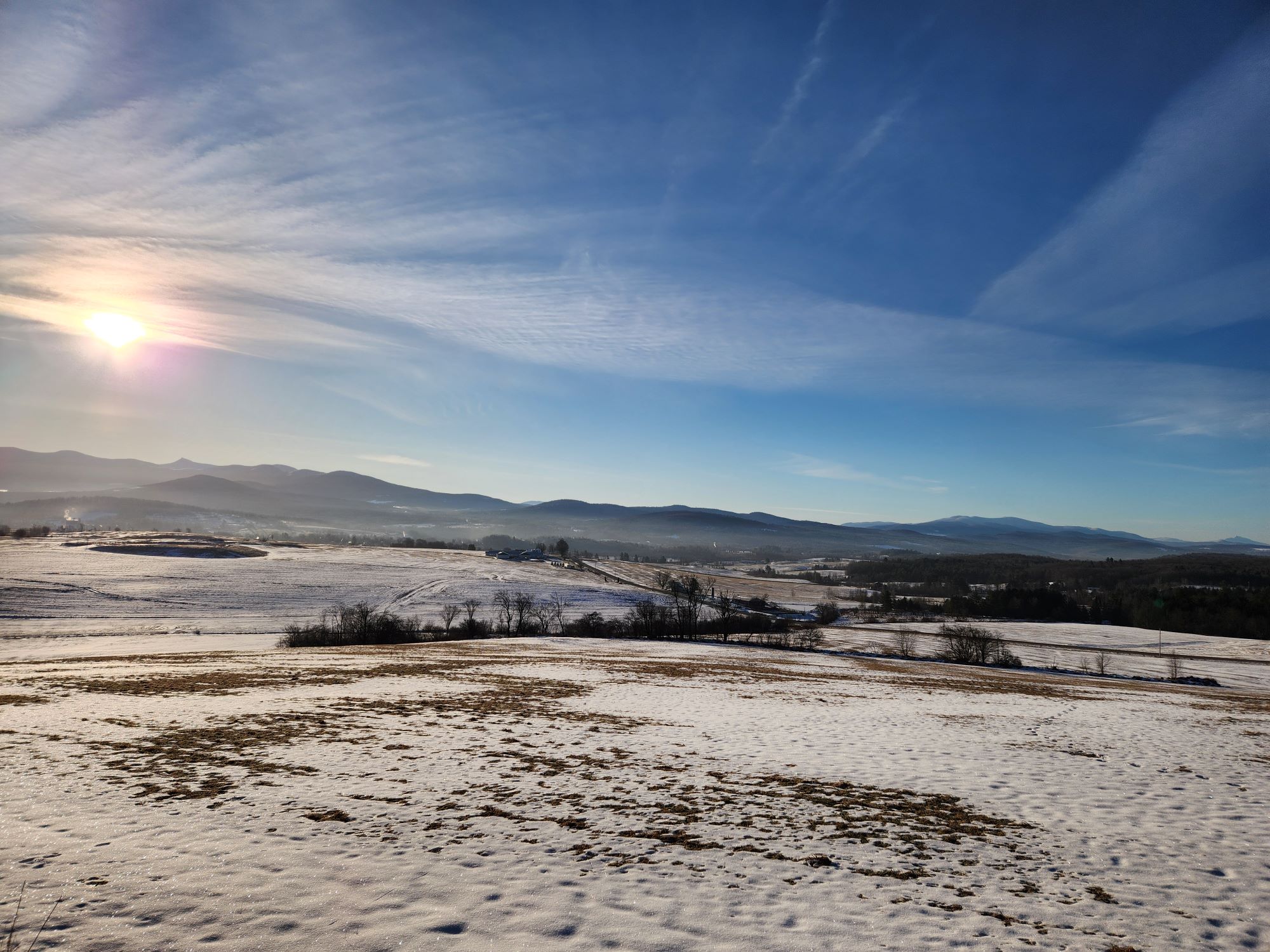 Le 7 février 2024. Le soleil s’élève derrière Jay Peak. Il y a une demi-heure à peine, le pic se découpait en clair-obscur sur une aurore au halo orangé. Le plus haut sommet de la région, une canine dans la chaîne. Les autres monts au dos rond ondulent jusqu’au mont Mansfield qui émerge dans le lointain du sud-ouest. Le voile de la nuit se retire du paysage comme l’onde d’une marée basse. Les ombres naissent au pied des troncs d’arbre et des piquets de clôture. Les premiers rayons s’accrochent aux fils et emportent de poteau en poteau leur ruban de lumière le long de chemins qui ne serpentent pour personne. Des fenêtres s’éveillent dans une joyeuse étincelle. En fait, il y a peu de chemins et peu de fenêtres.