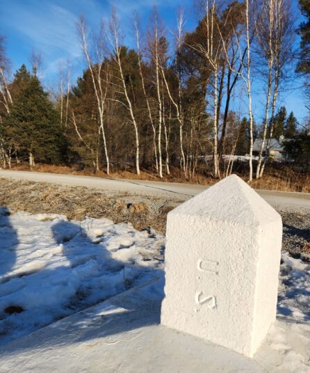 Mais, il y a cette borne, plantée au bord du chemin. Blanche. Un gros champignon en ciment taillé en biseau. Même pas en marbre comme ses consœurs qui balisent d’autres culs-de-sac de la région. Sur le côté nord est gravé CANADA. Nous supposons que le côté sud arbore U. S. En trois pas, nous pourrions aller vérifier, mais nous aurions franchi la ligne, nous aurions mis le pied en territoire américain.