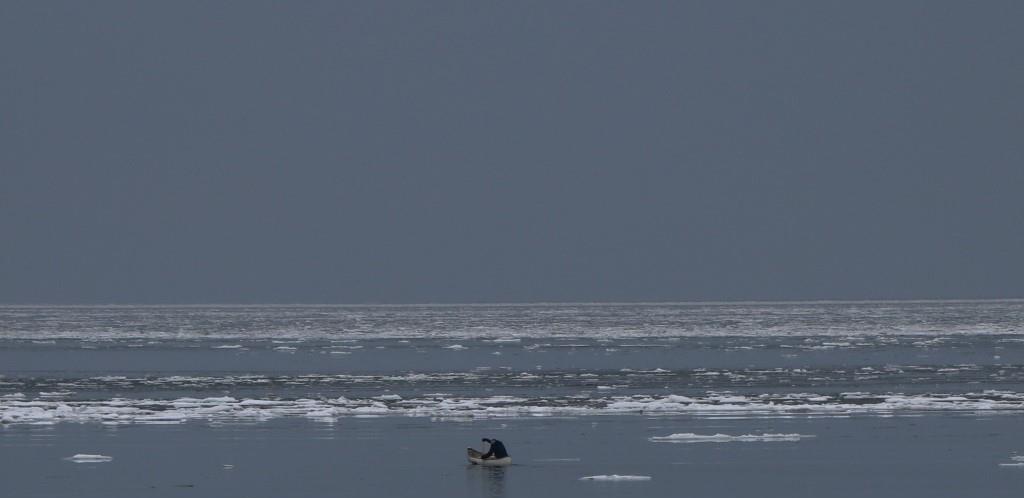 La mer est calme. Les glaces sont encore fluides. Il saute dans son canot et met le cap sur le large.