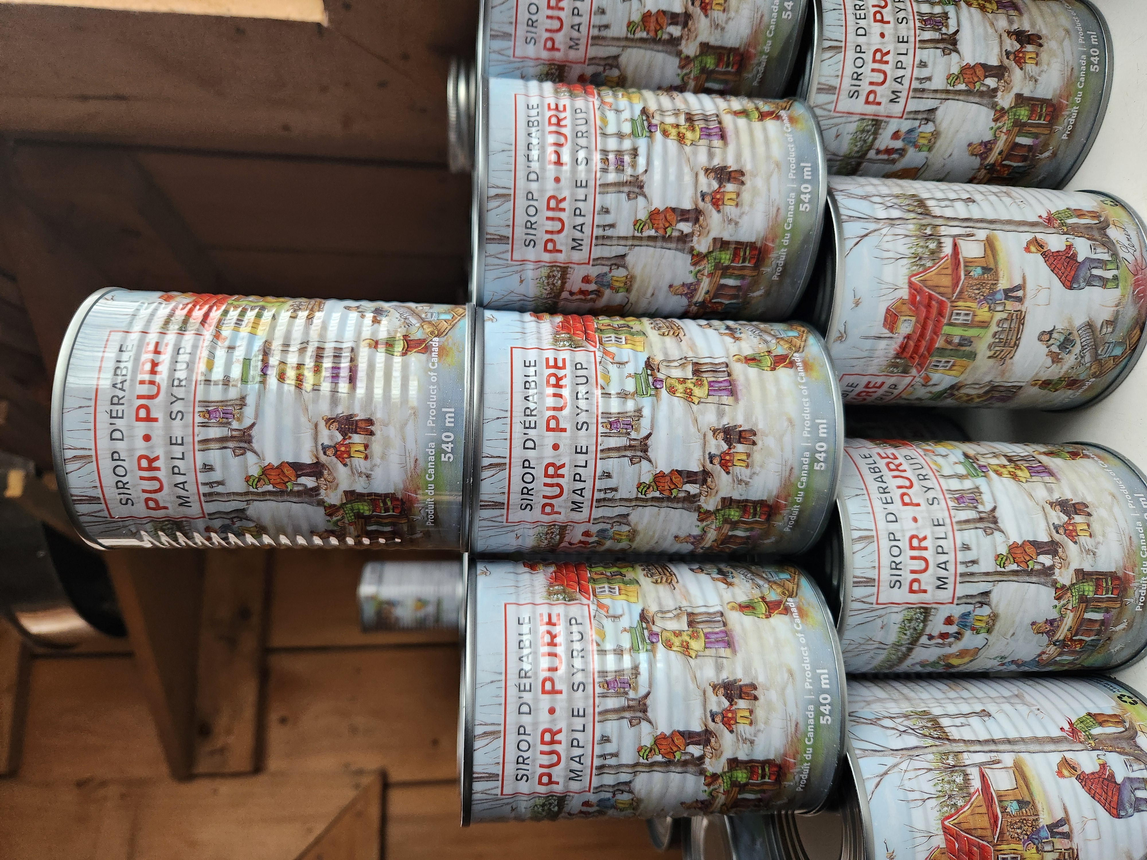 La ligne entre un sirop trop fluide et déjà brûlé est mince. Il faut vérifier le précieux liquide avec un hydrotherme pour la température (219 oF) et un réfractomètre (66 degrés Brix) pour la concentration de sucre. Il y a aussi la bonne vieille méthode de la louche. Claude la plonge dans le bac et laisse s’écouler un mince filet. Lorsque la dernière goutte perle et s’étire, c’est prêt. La sirotière garnie d’un filtre de feutre est alors placée sous le robinet : l’or doré peut jaillir. Le premier sirop du matin prend environ 4 heures. Une fois la machine à vapeur lancée, les autres coulées se font en 2 heures. Ensuite, on place la sirotière sur le comptoir pour remplir les cans et les sceller, encore une fois à l’ancienne avec une sertisseuse à manivelle.