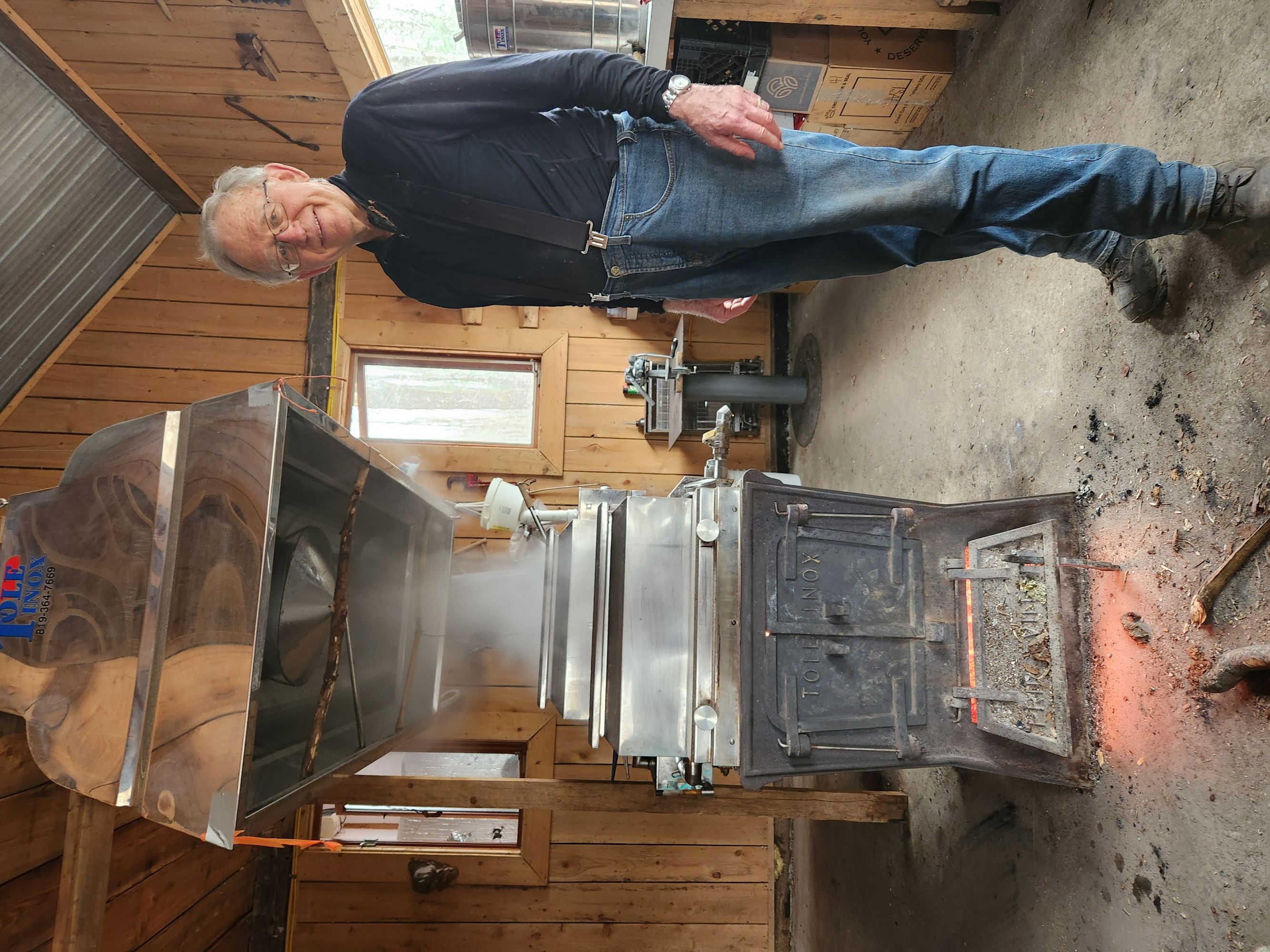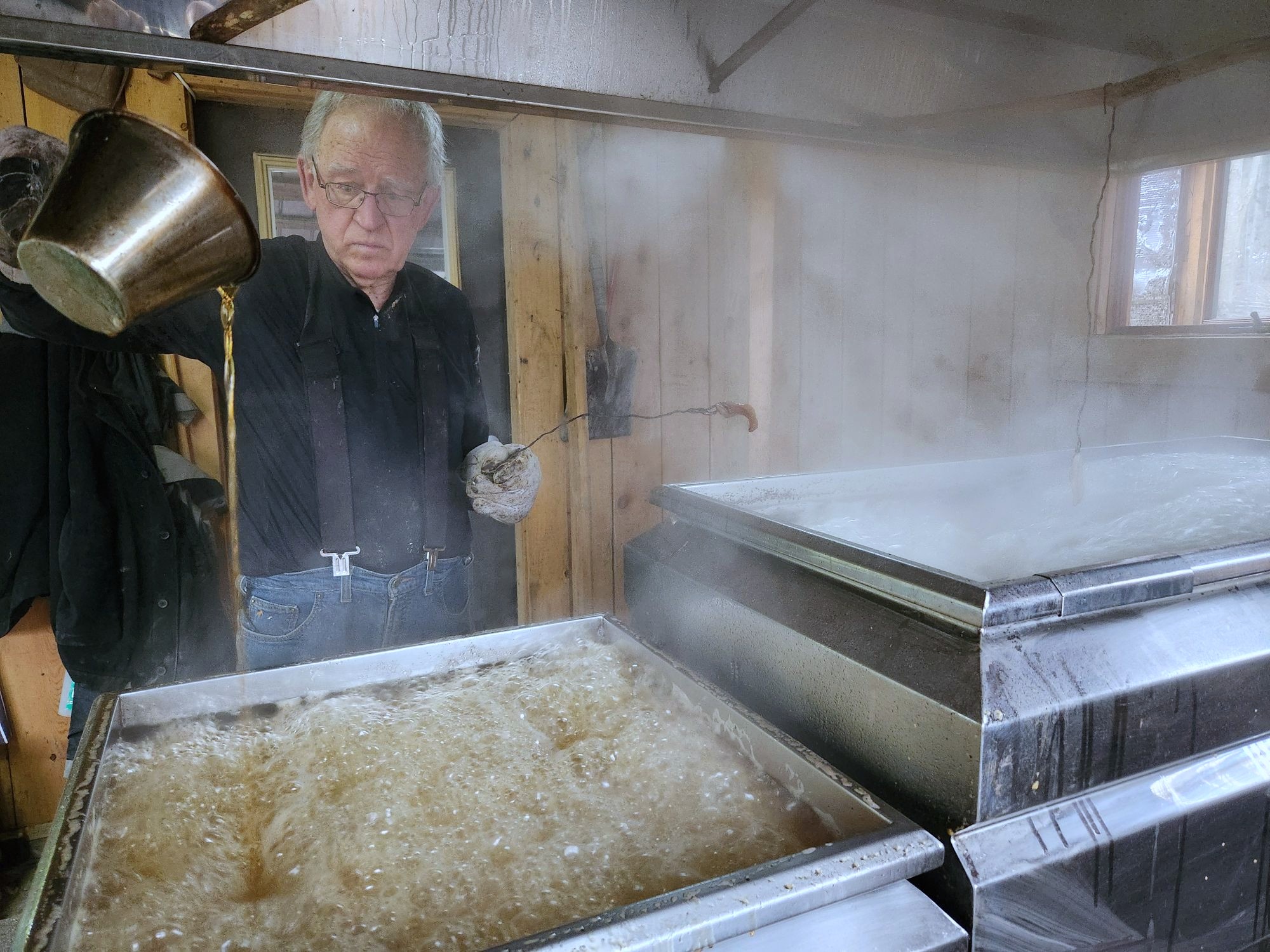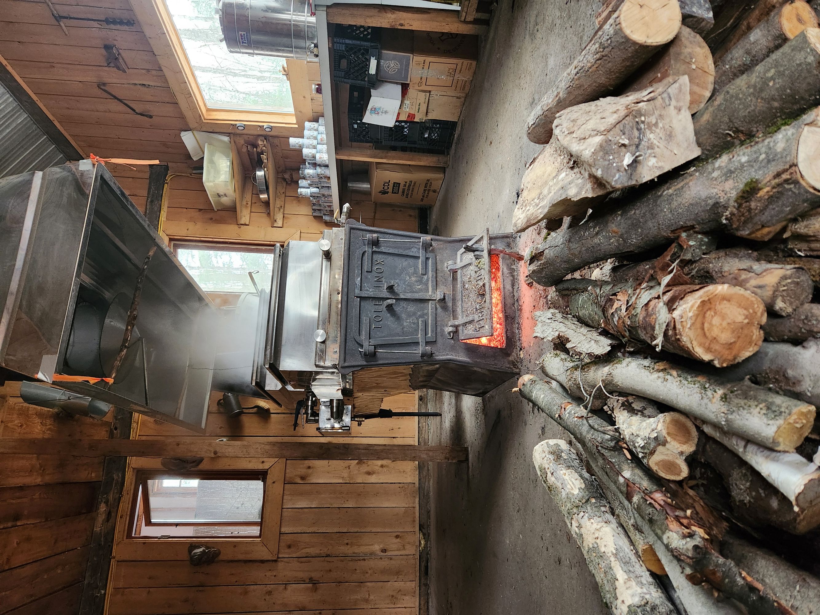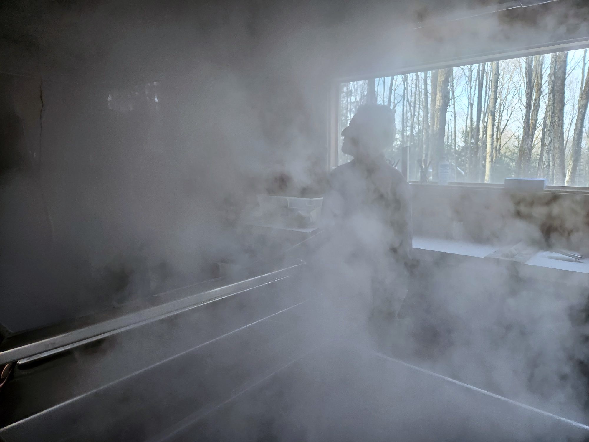Allumé tôt le matin, un feu d’enfer fait rage derrière les portes de fonte. Vorace, il demande sa ration de bûches toutes les 15 minutes et avale jusqu’à 15 cordes de bois franc pour la saison. La brume sucrée qui monte de l’évaporateur donne aux artisans des silhouettes de fantômes.