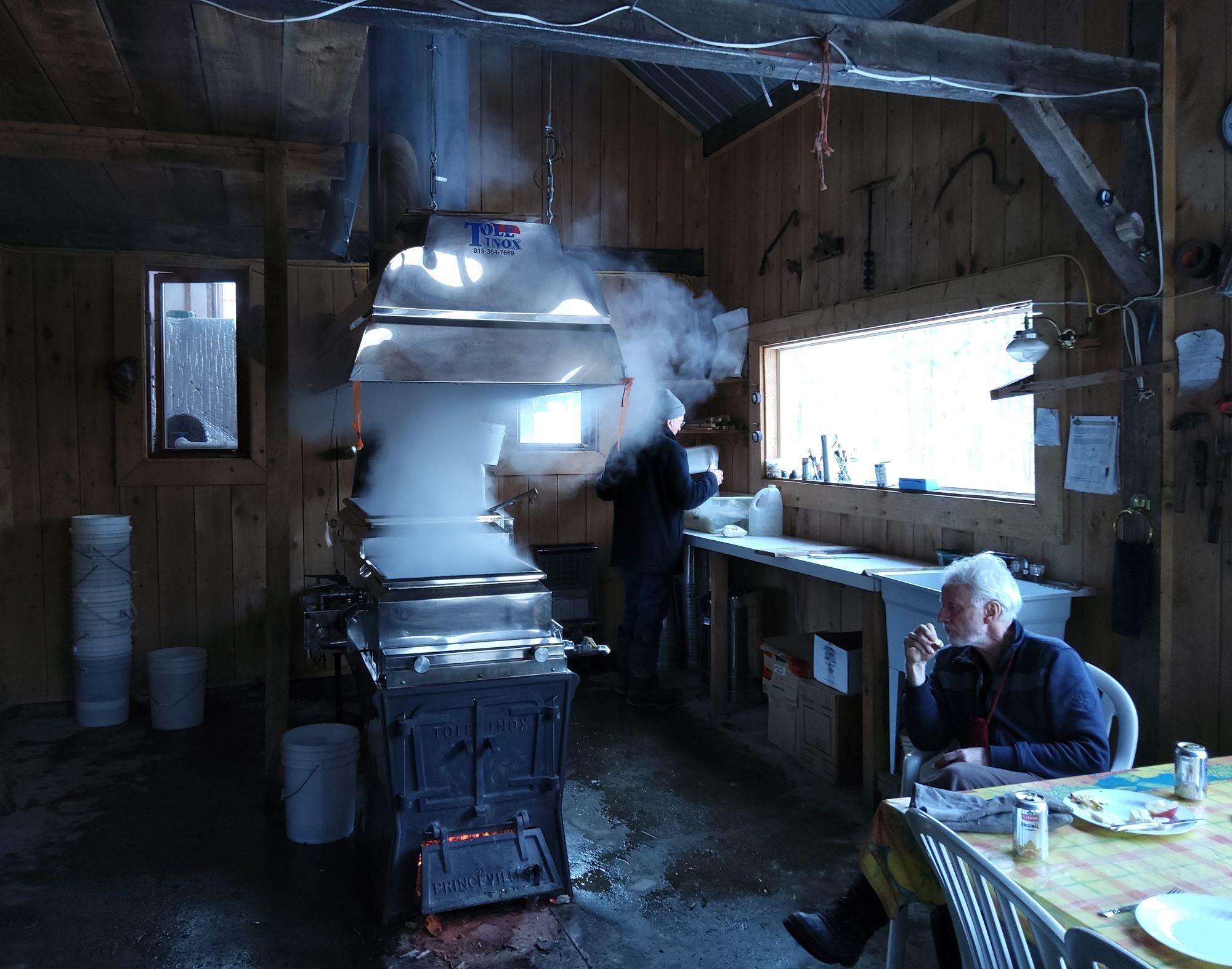 « La cabane était désaffectée depuis des lustres. Quarante ans peut-être. Je l’ai isolée avec le même bois de pruche. J’ai refait le plancher de béton et remplacé tout l’équipement d’évaporation. J’ai construit une terrasse à l’arrière pour accueillir la visite. » Il a aussi déniché un lot de chaudières à bon prix dans une annonce du journal La Terre de chez nous auprès d’un acériculteur heureux de se débarrasser de ses vieilleries pour prendre le virage tubulaire avec des artères de plastique bleu qui serpentent d’arbre en arbre comme les tentacules d’un réseau de perfusion.