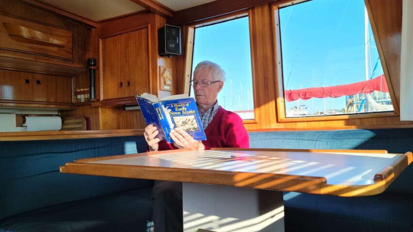 Dans le carré, le temps est suspendu dans une quiétude baignée de clarté nordique. L’ambiance est sereine, presque studieuse, comme celle d’une bibliothèque. Tout est impeccablement placé, astiqué. Aucun désordre de retour du large. Les boiseries des murs couleur miel arborent des grands classiques marins en laiton : lampe à huile, horloge et baromètre, cloche et ancre. Une maquette de coque sculptée côtoie une plaque d’hommage des Escadrilles canadiennes de plaisance.