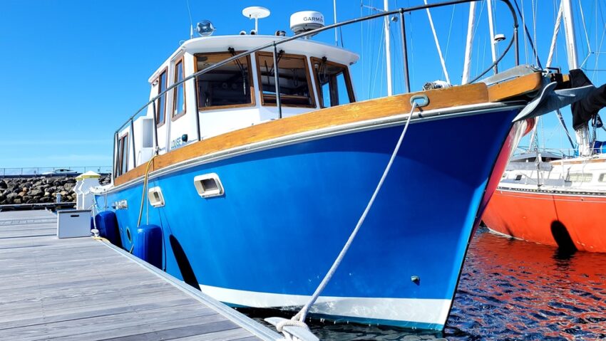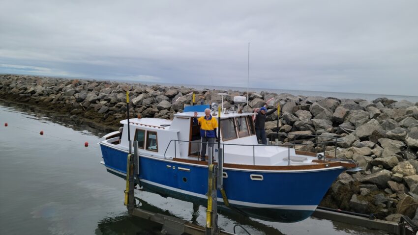 Sur sa planche à dessin apparaissent les lignes harmonieuses d’un trawler de 32 pieds à trois cabines qui équilibre grandeur et espace intérieur. Bateau de plaisance, il a des airs de bateau de pêche. Un naturel pour le fils de pêcheur. Le trawler n’est pas un speed boat bouffeur d’essence et frimeur de beau temps qui déjauge pour creuser un sillage arrogant et inutile. Le trawler est un chameau, un flâneur. Sa carène à déplacement lui assure une bonne souplesse dans les vagues, même par gros temps. Sa vitesse maximale de coque est de 7,3 nœuds, propulsé par un Volvo Turbo 4 cylindres de 110 cv. Pourquoi aller plus vite ?