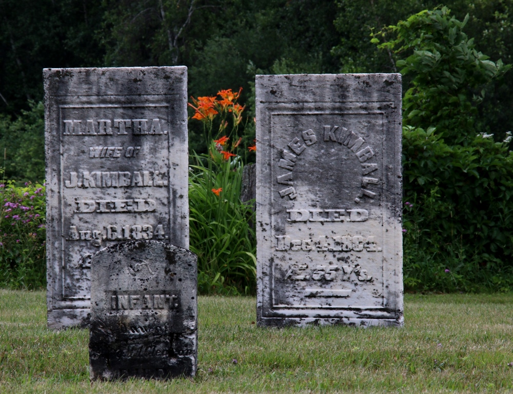 À l’écart, près d’un bosquet de lys sauvages, on découvre que Martha, décédée le 6 août 1834, a été l’épouse de James Kimball lui-même décédé le 4 décembre, à 55 ans. Est-il mort de chagrin quatre mois après sa femme. Devant leurs tombes réunies est blottie celle d’un petit enfant. Peut-être mort avec sa mère à la naissance ? INFANT suggère qu’il n’a pas eu le temps d’avoir un prénom.