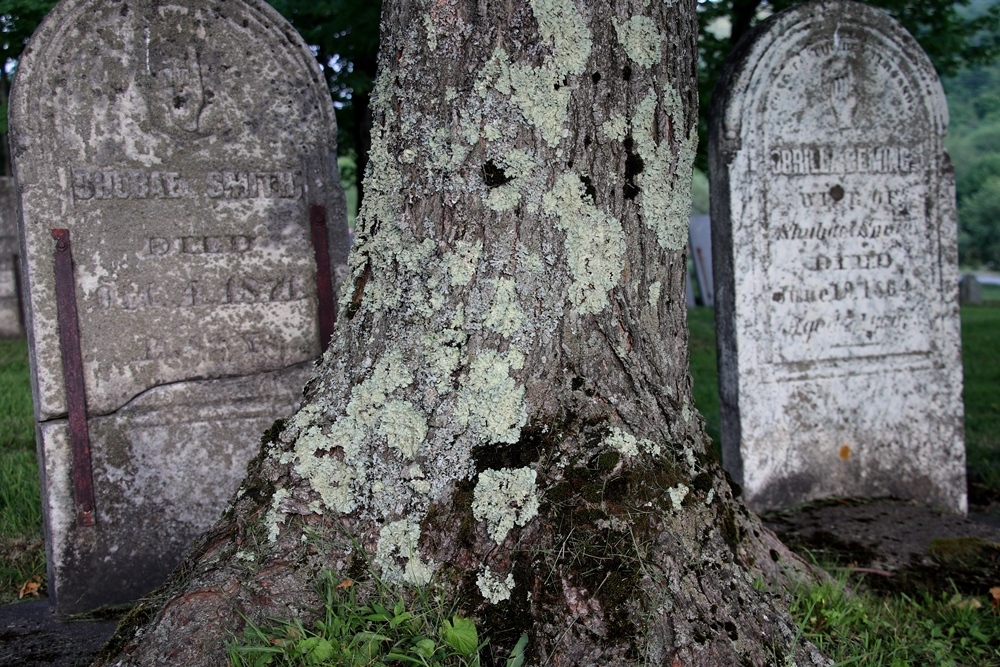 Le passage du temps imprime les mêmes rides de lichen sur la pierre des tombes et le bois des arbres. La vie et la mort sont bonnes voisines.